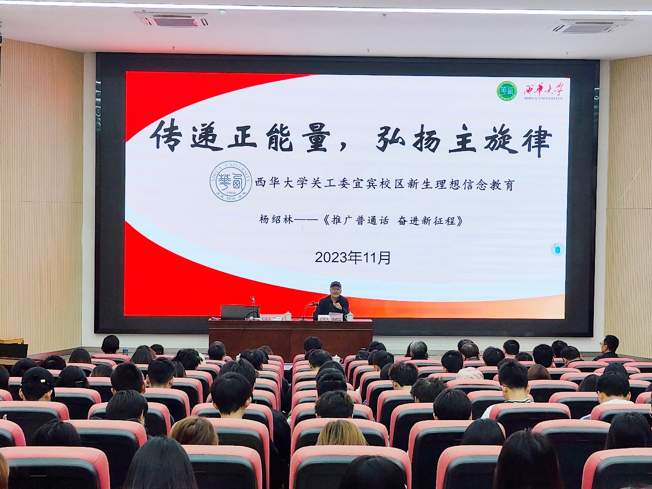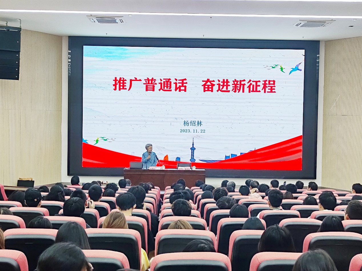 我校退休教授杨绍林受邀作题为《推广普通话 奋进新征程》的讲座。杨教授以风趣幽默的方式深入浅出地阐述了普通话的历史和演变、我国各地域之间的语系分布状况,以及国家为普及普通话所做的工作,强调了在全球化背景下,从国家战略层面到学生职业发展,讲好普通话对于大学生都至关重要,鼓励学生在大学期间注重语言修养,努力提高普通话水平。杨教授与学生们积极互动,提问、辨音和集体朗诵等环节穿插其中,整个讲座将“‘普’雅言风,‘通’华夏情,‘话’中国梦”的主题贯穿始终。现场掌声、欢笑声不断,新生们不仅拓展了知识面,也明白了学好、讲好普通话的重要意义。