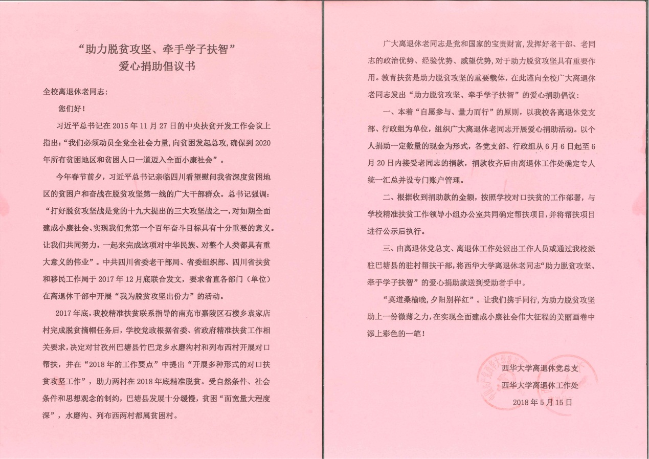 为贯彻落实中共四川省委老干部局、省委组织部、四川省扶贫和移民工作局关于在省直各部门(单位)离退休老同志中开展“我为脱贫攻坚出份力”活动的要求,离退休工作处以组织助力脱贫攻坚、献出一份爱活动作为为党和人民事业增添正能量、助力我校2018年对口帮扶甘孜州巴塘县脱贫工作的有力抓手,于今年开学之初即召开离退休各行政组长会议,就活动的开展提出了要求,并对相关的工作做了精心的准备,为保证将老同志的爱心真正落到扶智强志的实处奠定了坚实的基础。