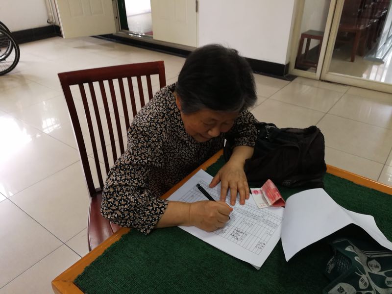 离退休工作处工作人员与离退休行政组组长在统计核实爱心捐款