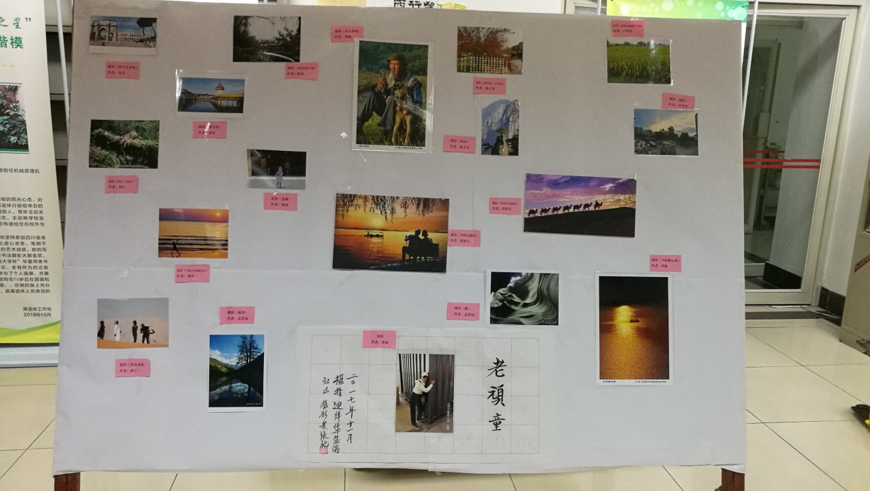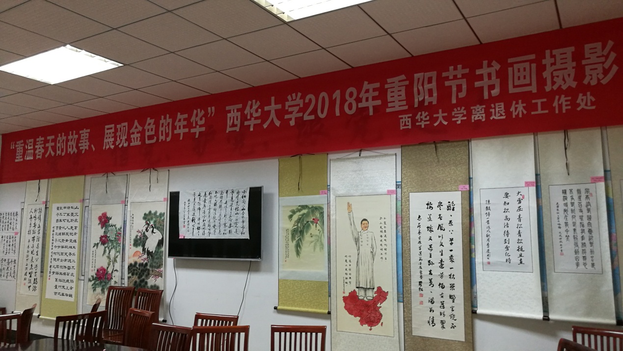 在联欢茶话会举办的同时,庆祝重阳节的书画摄影展在夕阳红活动中心阅览室开展。本次书画摄影展有29位老同志提供了56件参展作品,其中绘画作品17幅、书法作品21幅、摄影作品18张,不少作品反映出我校离退休老同志较高的艺术功力,表达了老同志们对美好生活的赞美之情。