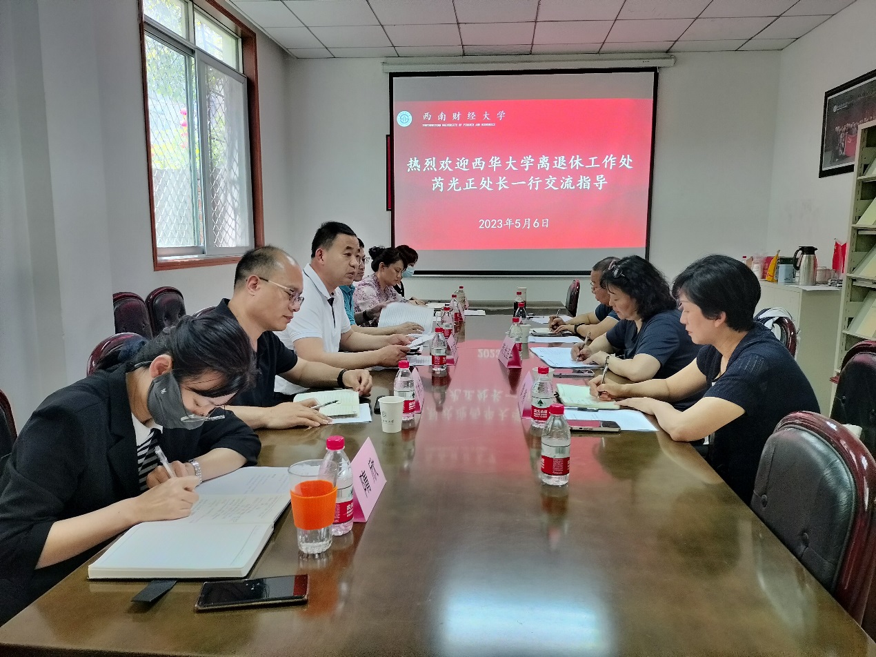 西南财经大学离退休工作处处长张立斌、离退休党委书记王苏热情接待了调研组一行,并召开了座谈会。会上,双方围绕党建引领、信息化建设、岗位设置、文体活动开展,以及关工委组织和队伍建设等方面进行了交流探讨。