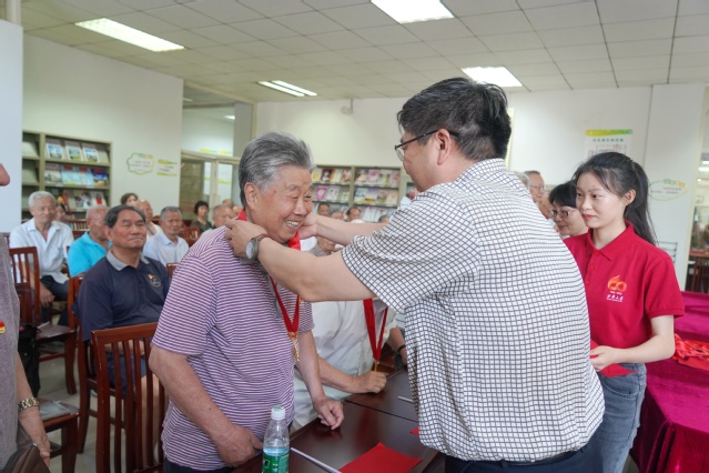 校领导向现场的老党员代表颁发纪念章